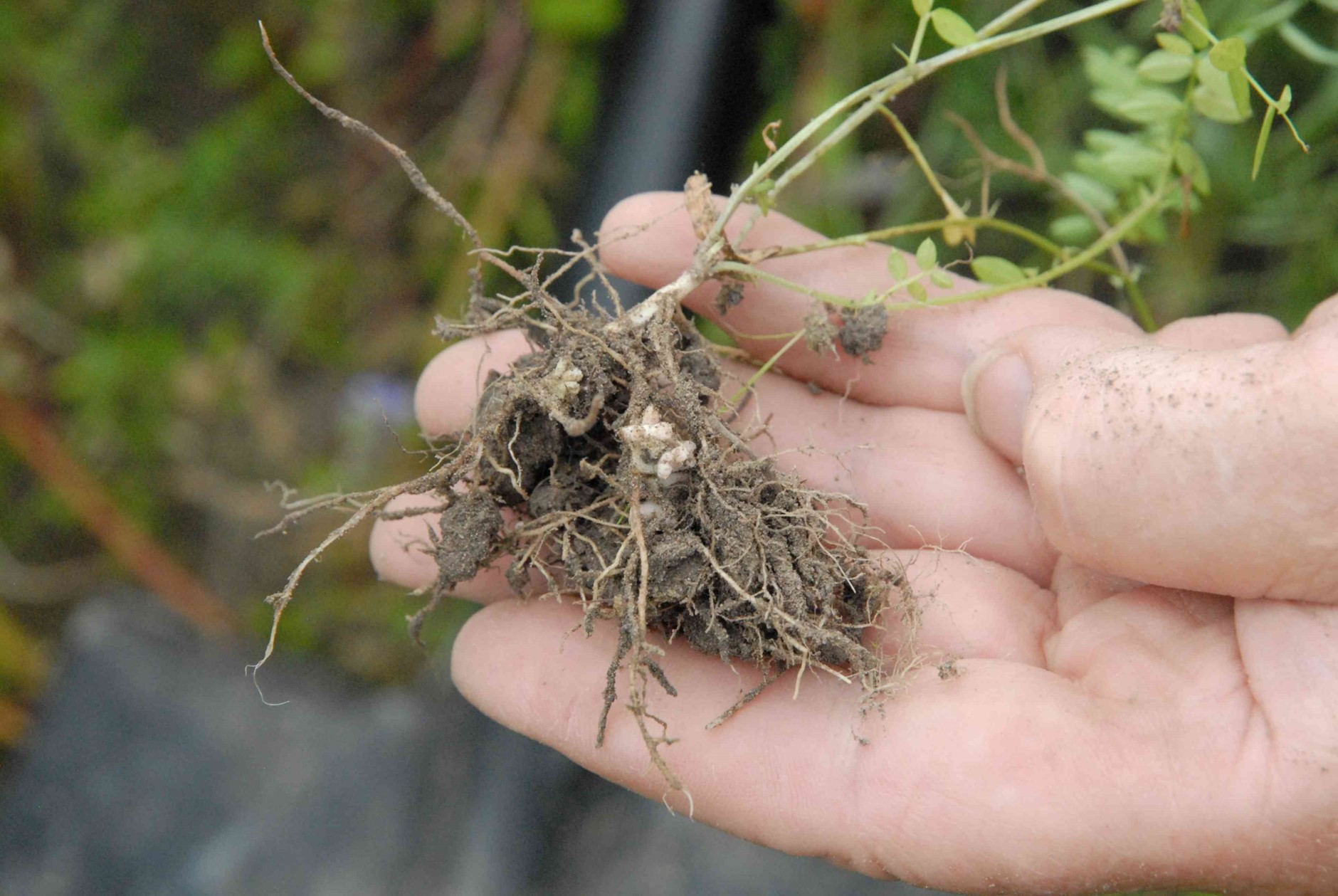 ProAgrian Arja Nykänen haki lapion ja sitten päästiin pureutumaan juuristovyöhykkeeseen. Maa oli helposti murenevaa, vaikka pinta oli paikoin kuorettunutta. Ruisvirnan juurissa oli nähtävissä selkeät juurinystyrät, jotka olivat väriltään punertavia, mikä kertoo, että typen sidonta on käynnissä. Osallistujia pohditutti, millainen seos parhaiten tukisi maan kasvukunnon parantamista erilaisilla pelloilla. Kuminalla ja sinimailasella voi olla hyvin vahvat juuristot, jotka tuottavat maan rakenteelle hyötyä. Palkokasvien, esimerkiksi ruisvirnan, juurieritteet ruokkivat hyödyllisiä mikrobeja.