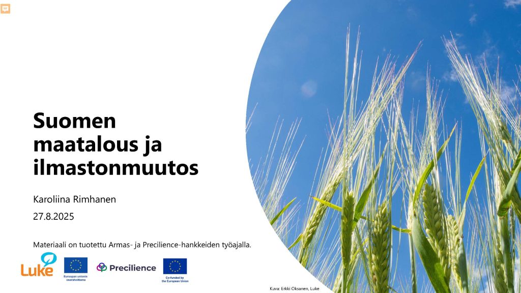 Kalvosarjassa käydään läpi miten ilmastonmuutos vaikuttaa Suomen maatalouteen, mitä hillintä ja sopeutuminen tarkoittaa, ja mitä käytännön toimia jo tehdään ja miten niitä arvioidaan. Kalvosarjan on tehnyt Luonnonvarakeskuksen tutkija Karoliina Rimhanen. Materiaali on tuotettu Armas- ja Precilience-hankkeiden työajalla. Kalvosarja soveltuu esimerkiksi maatalousalan opetuksen tueksi. Kalvosarja Suomen maatalous ja ilmastonmuutos (Karoliina Rimhanen 27.8.2025).